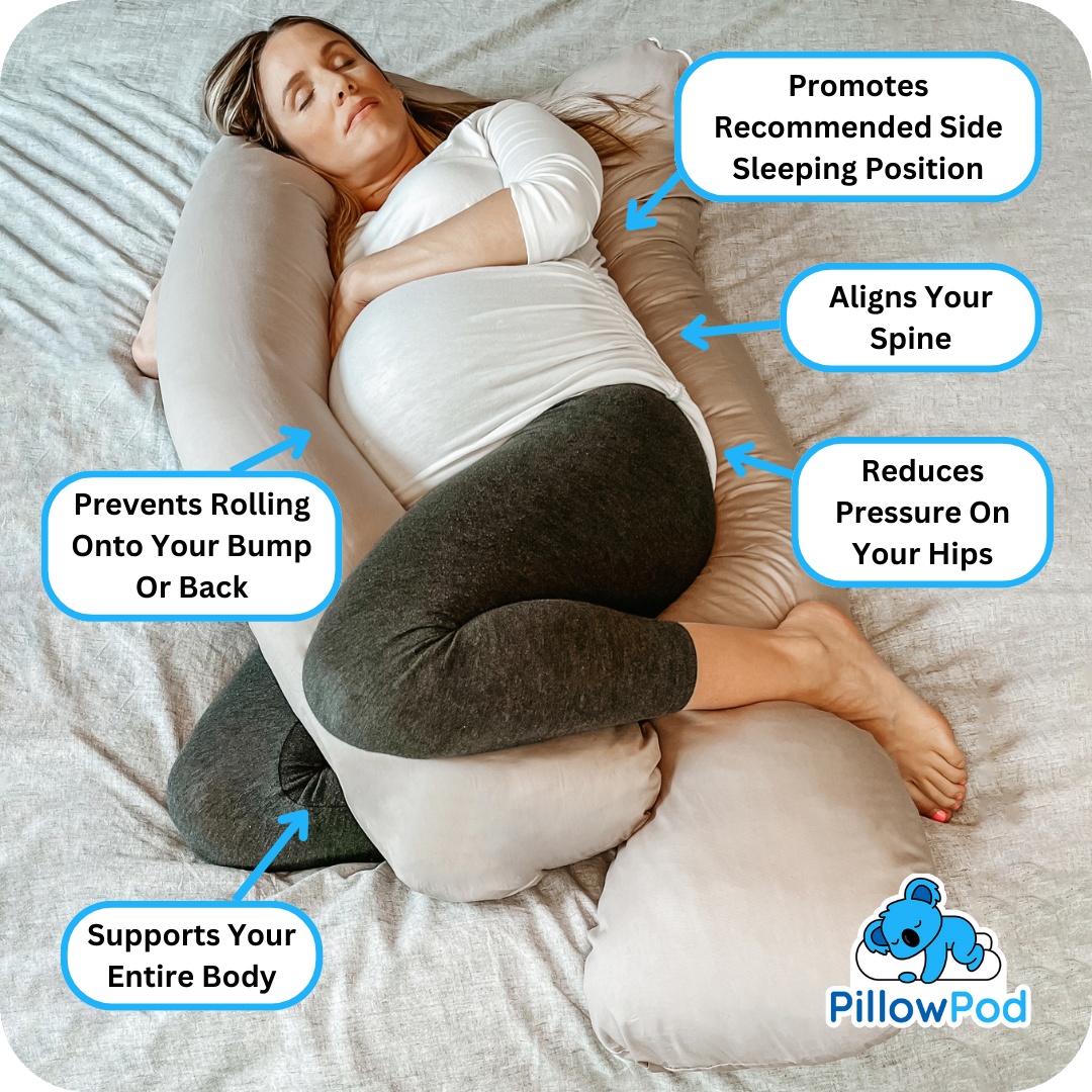 The Pillow Pod is a long, wraparound maternity pillow designed to support side sleeping, which is recommended during pregnancy.