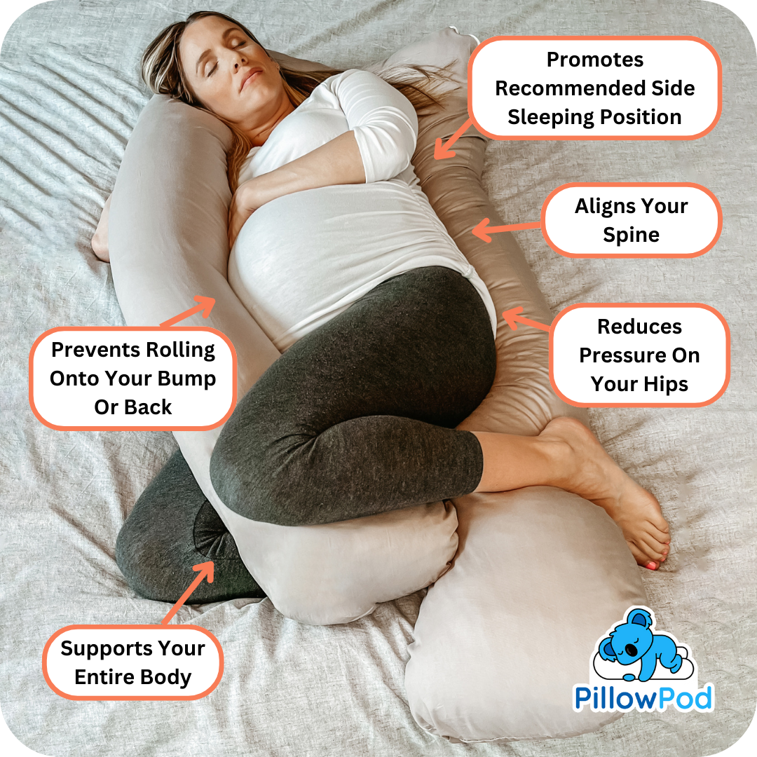 Get the sleep you deserve, with support where you need it most. The Pillow Pod Support Pillow’s unique shape will cradle your baby bump and support your back, no matter which side you sleep on. Immediately feel the relief of reduced pressure on your hips and spine when you use a Pillow Pod, and sleep better today!